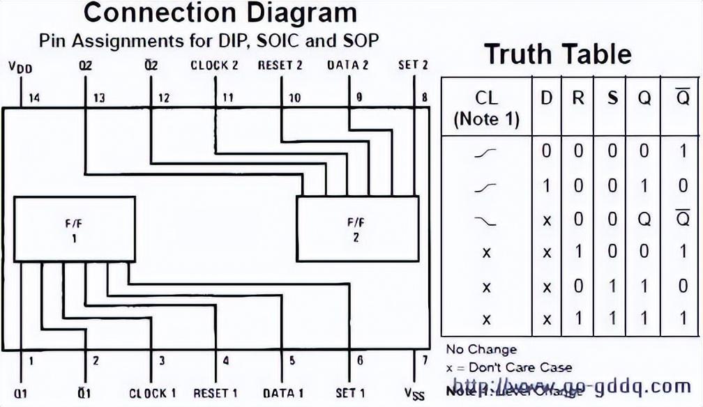 CD4013的引脚图与真值表 在电子技术中,N/2(N为奇数)分频电路有着重要的应用,对一个特定的输入频率,要经N/2分频后才能得到所需要的输出,这就要求电路具有N/2的非整数倍的分频功能。CD4013是双D触发器,在以CD4013为主组成的若干个二分频电路的基础上,加上异或门等反馈控制,即可很方便地组成N/2分频电路。
