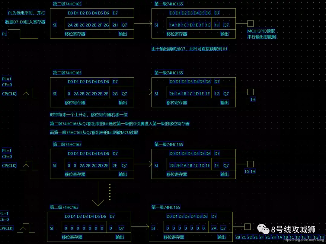 最后再以图文并茂的方式总结下74HC165级联后的工作过程,如下图: