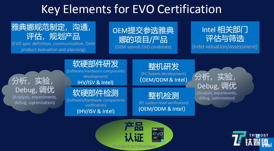 具体到流程方面,首先,英特尔会制定规范并与所有的合作伙伴进行沟通,再对即将设计的产品进行评估,随后则是OEM厂商提交自己设计完成的产品,英特尔进行评估和筛选,最后双方要对一些产品表现的细节进行优化并通过最终的认证。