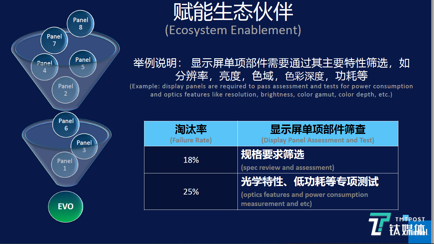 “整个Evo产品认证的过程,就是一个漏斗化的流程,以显示屏为例,它是一个单项的部件,在业界有十多个显示件供应商。不同显示屏的各类指标都不一样,无论是分辨率、亮度、色域的广度,这些都是针对显示屏单项的指标,英特尔则要针对单项指标制定出一个综合体验标准,再将这一标准套用于认证产品之上,这背后带来了很大的工作量,”郑炯表示。