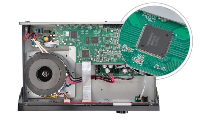 打开机盖,供电、解码、前级、后级等排列有序。PCB板上的芯片和密密麻麻的精密电子元件,无论从排版布局还是生产制作 ,处处彰显出大厂风范。SMT自动贴片工艺杜绝虚焊、漏焊的发生,使电路板和电脑主板一样的可靠耐用,产品稳定性更强。