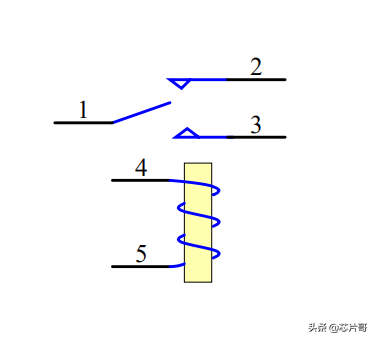 线圈部分是4脚与5脚,触点部分是1脚、2脚与3脚,在线圈的中间一般为铁芯或者磁芯,主要是为了更好效果的导磁,使线圈产生的磁环线更集中地在线圈周围。