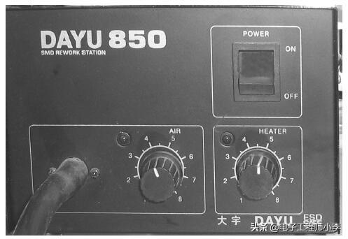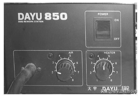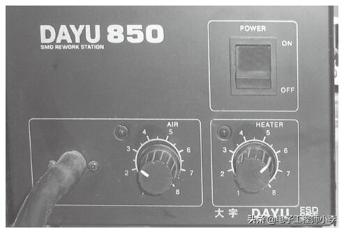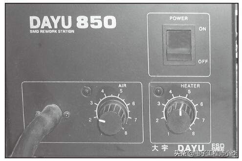 1)首先将热风枪的温度开关调至5级,风速调至4级,然后打开热风枪的电源开关。如图1-49所示。