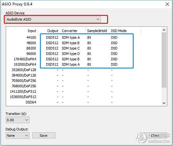 先在最上面ASIO Device里面选择你要输出的设备,可以是你的界面或者是你的解码耳放一体机的驱动。接着最关键的步骤就是在这个ASIO proxy页面配置不同PCM输入信号对应的DSD输出信号,也就是图中蓝色部分,可以点击配置,这里我全部设置成我的设备所能支持的最高解码率DSD512,这个需要根据各位所用于的界面以及解码器的性能进行配置,不同的界面和界面所能支持的最高DSD解码率都不相同,如你设置的码率超过了你的界面或者解码器的能力,那样就会播放不出声。比如我的另一台topping D50解码器,虽然它支持DSD512,但是当我们查看它的具体规格的时候会发现DSD512是必须通过USB连接的时候才支持,如果你在它的前面接了一台界面,这个时候它的连接方式可能通过同轴COAX连接界面,这时它所能支持的最高码率只有DSD64,那我在这个Foobar ASIO proxy配置页面只能设置最高DSD64输出。