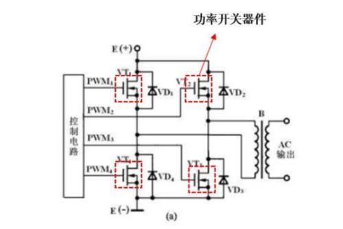 逆变电路中都使用具有开关特性的半导体功率器件(如IGBT、MOSFET等),由控制电路周期性地对功率器件发出开、关脉冲控制信号(如PWM脉宽调制信号),控制各个功率器件轮流导通和关断,再经过变压器藕合升压或降压后,整形滤波输出符合要求的正弦波交流电。