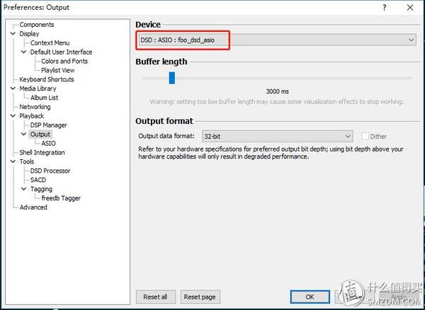 最后一步,回到Output设置页面,把输出设备设置为DSD:ASIO:foo_dsd_asio,下面的output data format可以设置为最高32bit。