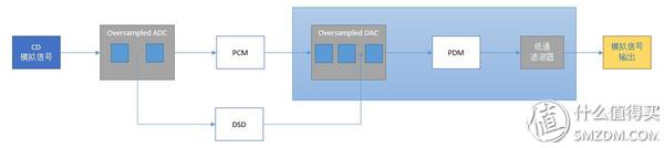 现代的数字音频格式有两种,PCM和DSD,PCM就是上一段提及的由二进制组成每个样本的模拟量,也就俗称多比特。而DSD由0和1的脉冲占比来表达模拟量,俗称单比特,那为啥需要DSD音频格式呢,那就需要先了解一下单比特。单比特依靠数学运算的方法在PCM中插入过取样点,插入7个取样点就是18倍过取样,这些插入的取样点与原信号通过积分电路进行比较,数值大的就定为1,数值小的就定为0,这就是脉冲密度调制信号(PDM),PDM经过一个开关电容网络构成的低通滤波器,1就转换为高电压信号,0就转换为低电压信号,然后通过级联积分,最终转换为模拟信号。插入取样信号会制造出许多高频噪音,所以还要经过一个噪音整形电路处理,将这些噪音推移到人耳听不到的频域。所以单比特解码转换精度不受限于电阻精度,但是设计过取样和噪音整形的电路难度很大,目前市面上主流的DAC就是采用类似这种转换过程的Delta-Sigma DAC,这个过程大体上来说牺牲了速度而换取了精度。