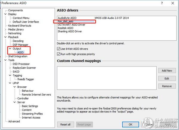 安装好这3个插件之后,就可以在Foobar配置界面左侧看到Output-ASIO,点击后出现以下页面