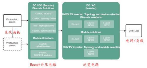 以英飞凌的三相组串式逆变器方案为例,其电路可分为两部分。Boost电路部分采用SiC MOSFET或IGBT的单管/模组方案,将光伏面板发电产生的电能进行升压。之后的DC/AC逆变电路可根据情况选用SiC MOSFET或IGBT的单管/模组方案,将升压后的直流电逆变成为交流电输入电网或接入负载。