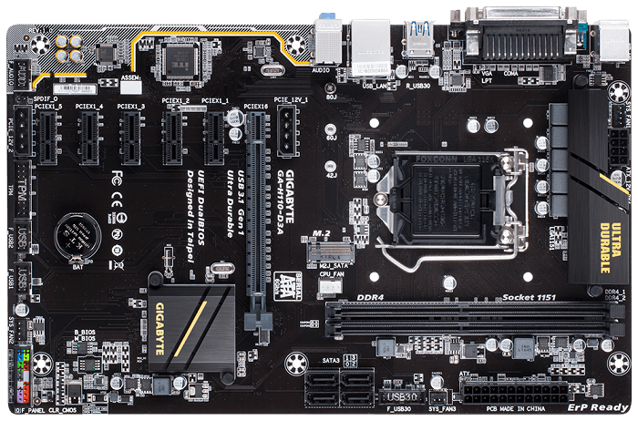 技嘉GA-H110-D3A使用的是比较稳定的H110芯片组,可用LGA1151接口处理器。采用高密度防潮湿PCB板,提供了1个PCI-E 3.0x16插槽和5个PCI-E x1插槽,最多可以支持6张显卡,对于不需要那么专业矿工的来说还是够用了。和一些矿板有所不同的是,技嘉这块主板还提供了一个M.2接口的SSD插槽,不过只支持最高6Gbps的SATA 3.0。