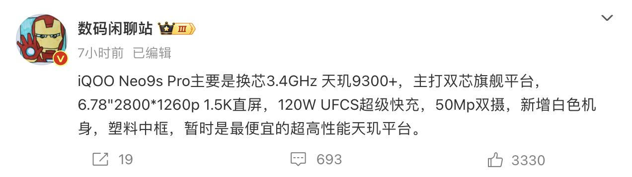 这位博主还表示,iQOO Neo9S Pro 暂时是最便宜的超高性能天玑平台。对于天玑9300+ 芯片的性能表现还是非常值得期待的,感兴趣的朋友也可以关注一下 iQOO 官方,相信距离发布时间也不远了。