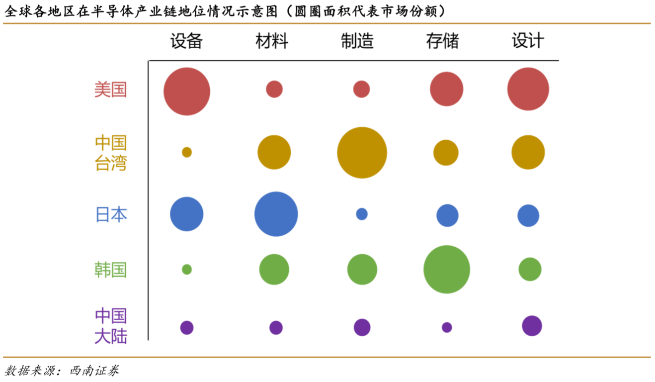 目前大家一般说到的半导体产业,其实就是包括了材料,元件,成品所有相关的产业。半导体产业最初起源于二战之后的美国,但历史上已经发生过两次产业转移。第一次转移是从20世纪 70 年代开始,由美国本土向日本转移,成就了东芝、松下、日立等知名品牌;第二次转移是在 20 世纪 90 年代末期到 21 世纪初,由美国、日本向韩国以及中国台湾转移,造就了三星、海力士、台积电、日月光等大型厂商。目前,半导体产业正在经历着第三次产业转移,目的地就是中国。 中国在过去二十多年,通过长期引进技术、培养人才、承接低端组装和制造业务,已经基本完成了半导体产业的原始积累,在高端的设计、制造、封测领域,也慢慢的成长起来。