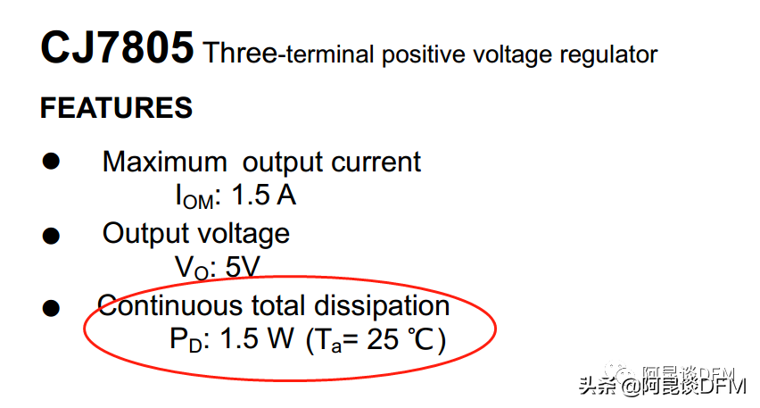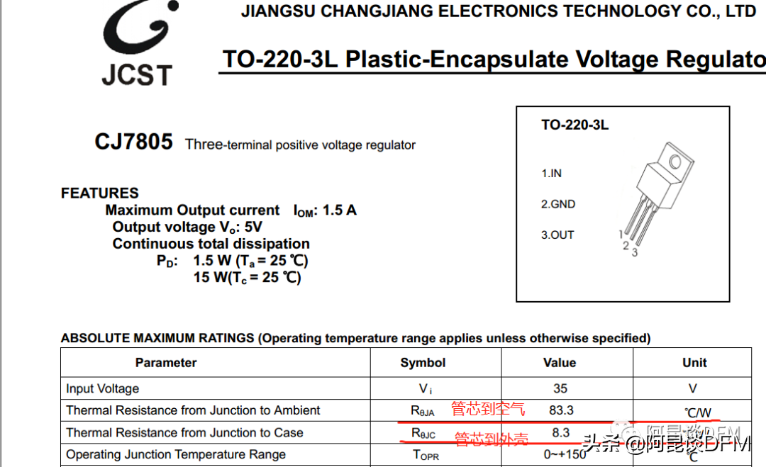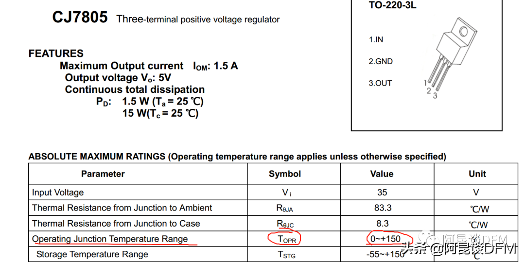 关于这个芯片的结温我们可以通过数据手册查看,比如这个长电的TO-220封装的 7805,有一条写着工作温度范围是0--150度。