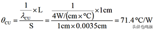 PCB 的铜厚度增加,系统组件的热性能也就越高。铜平面,典型1 盎司铜的单位面积(1cm^2)热阻