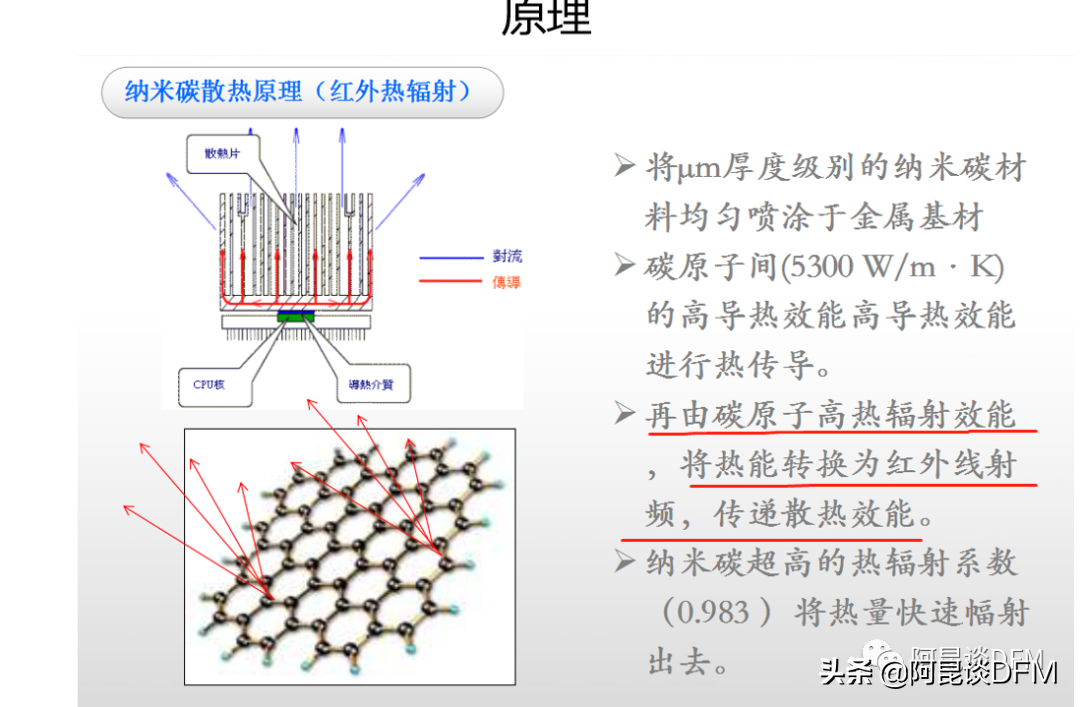 热辐射是物体因自身的温度而具有向外发射能量的本领,如果有关注阿昆之前文章,应该有印象,阿昆之前介绍过一款碳米碳的散热材料,这就是通过材料的特殊性,通过热辐射原理来主动散热。(严格说是先通过热传导将热量传到铜皮上,再通过钠米材料以红外方式热辐射出去)