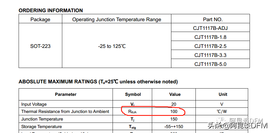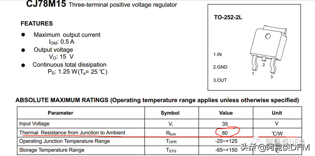 从以上可以看出,封装最小的1117系列,从晶圆到空气中的热阻达到100,散热最差,而252和220封装接近,之所以TO252封装的热阻80比TO220封装的83.3低一点好一点,是和其表面大小有点关系。
