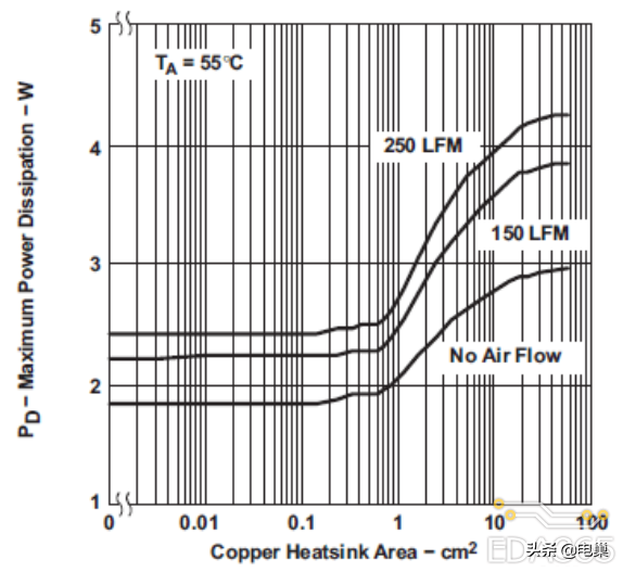 如果已知 θja,则从公式 1 中可以推出,该 θja 值下,不同 PCB 面积对应的不同最大耗散功率。