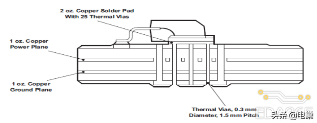 一般情况下,热焊盘都是接地焊盘,因此内部接地层和表面接地层是最常用的最方便的散热平面。典型的半盎司铜厚的 12mil 的过孔的热阻是 261℃/W。因此在热焊盘下面用尽可能多的过孔形成矩阵。这些过孔尽可能的连接多的 PCB 铜层,可以有效的进行散热,将大大提高散热效率。