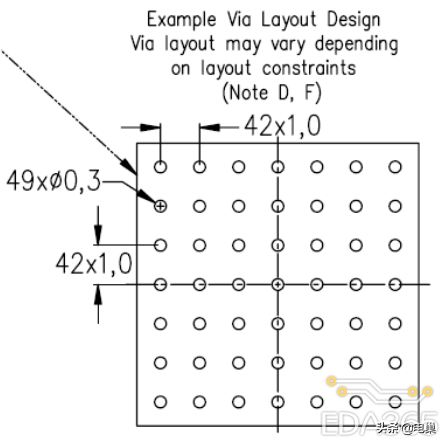 以 ADS62C17 为例,手册上为大家提供了参考的过孔设计方案。允许在热焊盘下面以 1mm 为间隔,铺设 49 个过孔,通过过孔和接地层连接在一起。7*7 的矩阵的过孔的热阻约为:261/49=5.33℃/W。