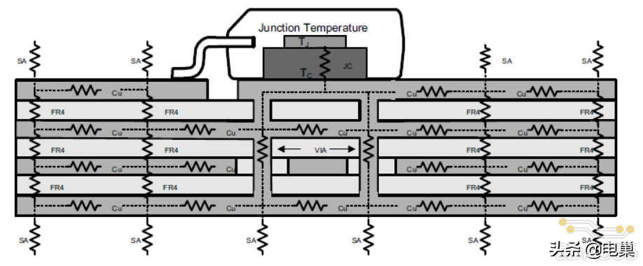 为了更好的计算和理解 θja ,一些新的参数不断被引入,θcu 是 PCB 板上铜的热阻,θFR4 是典型 FR4 板材 PCB 的热阻,θvia 是PCB 板上过孔的热阻,θsa 是 PCB 板表面到周围空气的热阻。下图是一个典型的 PCB 扩展热阻模型。