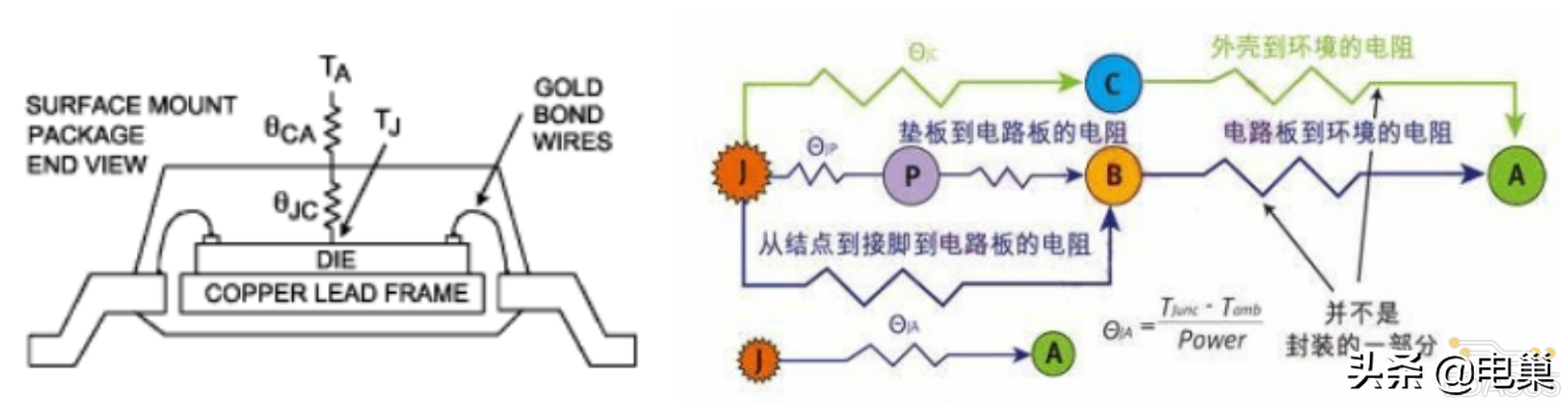 注意 θjc 表示的仅仅是散热通路到封装表面的电阻,因此 θjc 总是小于 θja。θjc 表示是特定的、通过传导方式进行热传递的散热通路的热阻,而 θja 则表示的是通过传导、对流、辐射等方式进行热传递的散热通路的热阻。