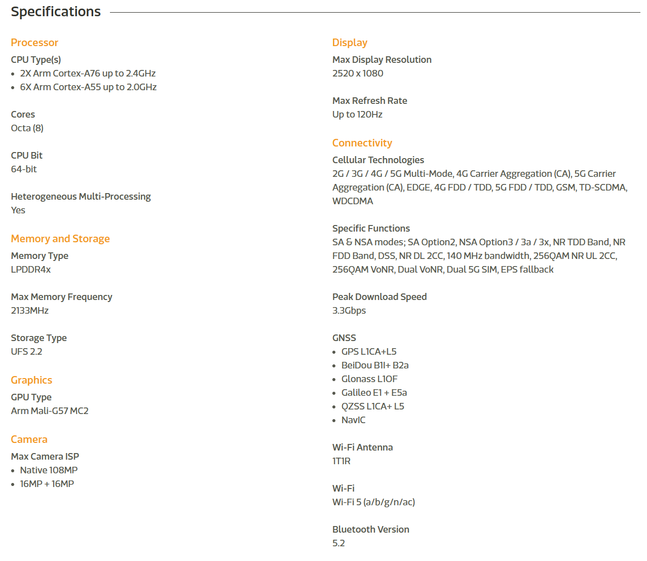 其他外围配置方面,它则是支持了最高 120Hz 的屏幕刷新率和 1080P 分辨率,以及支持最高一亿像素静态影像的 ISP,理所当然也支持了双模 5G 和最高 3.3Gbps 的下载速率,Wi-Fi 则是最高支持到 Wi-Fi 5,这部分相对来说比较一般。