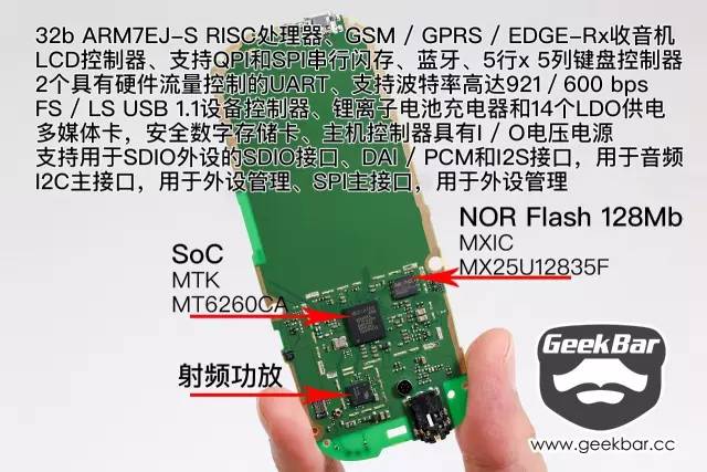 4、机器采用MTK芯片组,一颗SoC、一颗16MB闪存、一颗射频功放,组成了这台诺基亚3310。