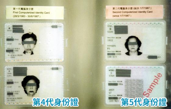 1983年推出的具高度防伪的第4代计算机身份证。1987年推出的第5代身份证,增加“香港永久性居民”概念并替换英式徽号,方便回归祖国后继续使用:
