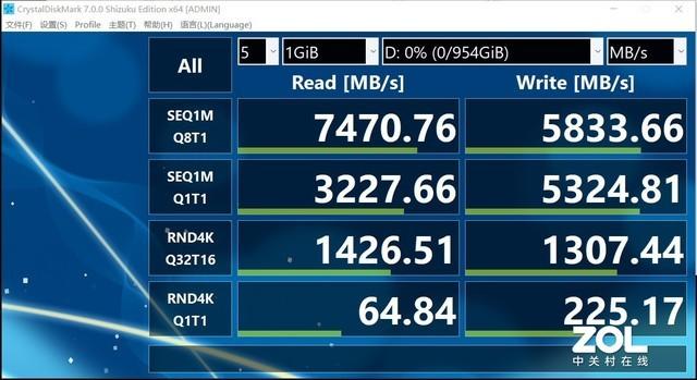 在CrystalDiskMark测试中,我们可以看到威刚XPG 翼龙S70的最大连续读写性能分别达到了7470MB/S以及5833MB/S,这样的性能可以说是目前问世的消费级PCIe4.0 SSD中理论数据最强的产品了。