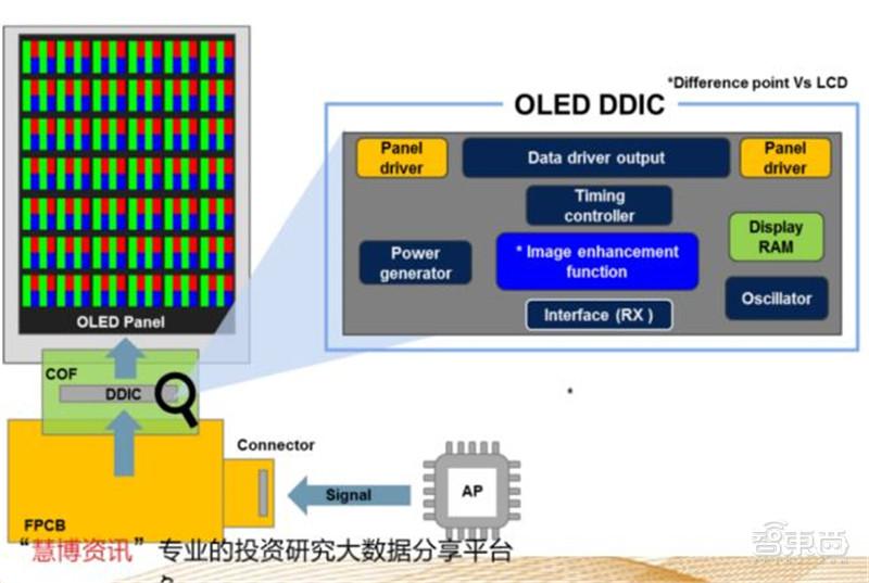 OLED的驱动IC目前为DDIC (Display Driver Integrated Circuit,简称DDIC), 主要功能:控制OLED显示面板,配合OLED显示屏实现轻薄、弹性和可折叠,并提供广色域和高保真的显示信号。同时,OLED要求实现比LCD更低的功耗,以实现更高续航。