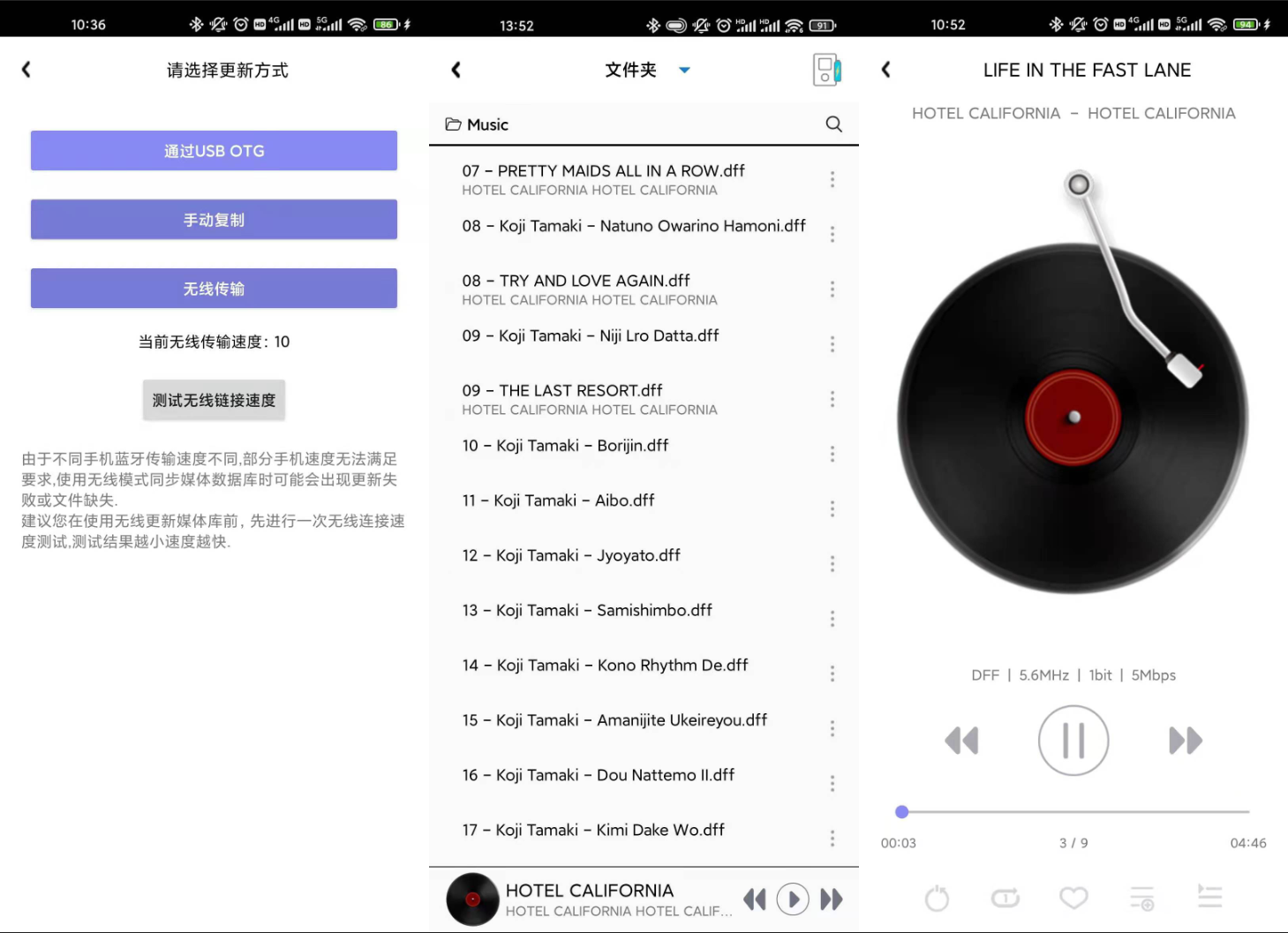 蓝牙连接的过程很迅速,配对成功之后会开机自动连接,打开HIFIMAN Remote APP(安卓端的APP需要在官方网站的固件页面下载)点击更新媒体库,就可以看到TF卡上存储的音乐,在APP中可以进行快退/快进、播放/暂停、拉进度条、循环方式等操作,而且音频文件的各类参数以及电量水平都可以呈现出来,和手机本地播放器的体验区别不大。另外在播放TF内的音乐时,单击电源键也可以切换/暂停音乐。