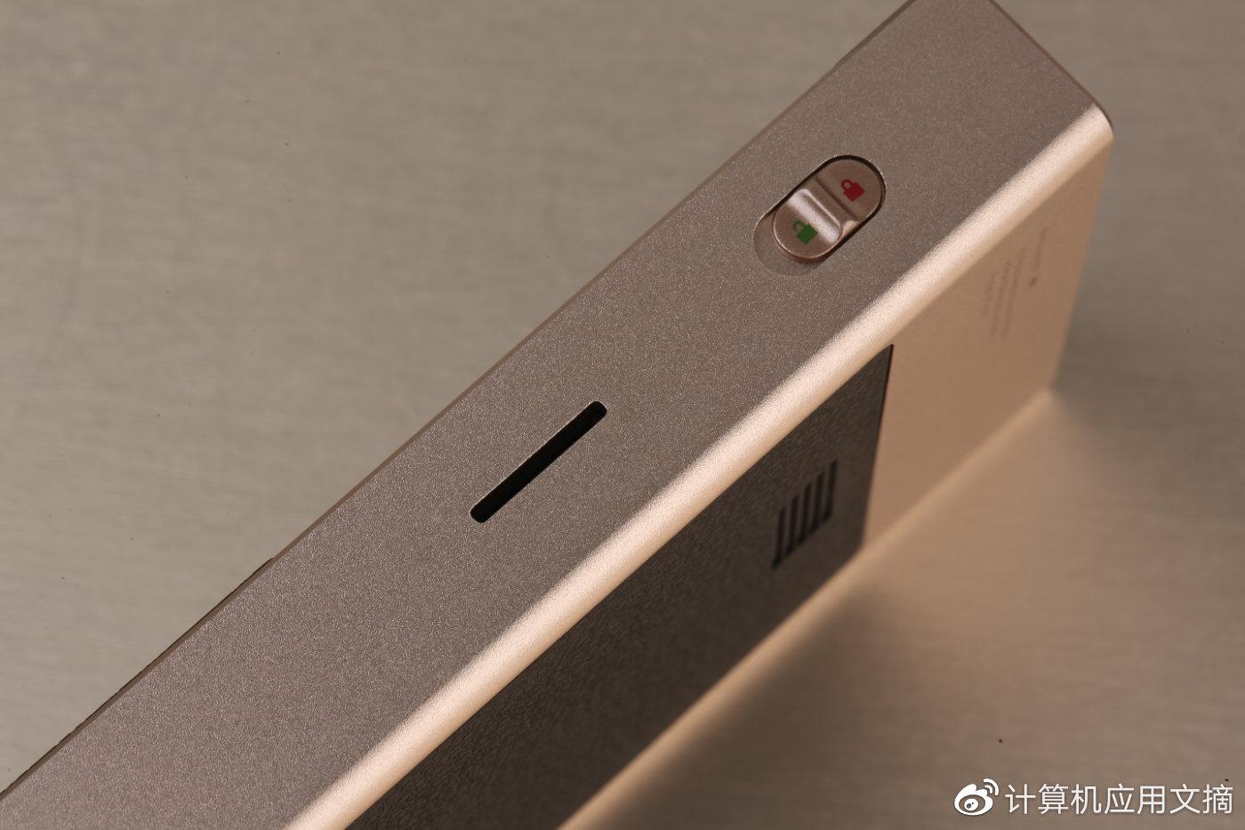 机身的配色为香槟金加黑色,主体框架采用了铝合金材料,边角部分都经过了切边过渡处理,拿在手中的手感饱满圆润不会硌手。正面按键和接口部分的面板其实是带皮革纹理的塑料,如果不上手的话塑料感比较轻微,整体做工、质感还是和HM1000有一定差距。