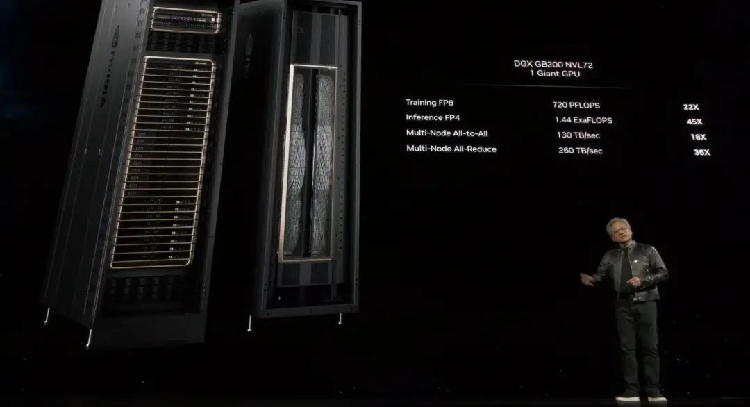 在这场两个小时的演讲中,黄仁勋公布了该公司迄今为止最强的AI加速卡——Blackwell GB200超级芯片系统,预先配置好整套系统的完整版GB200服务器,以及英伟达在AI软件(NIM微服务)、Omiverse云(模拟地球)、具身智能(机器人)等技术方面的最新进展。