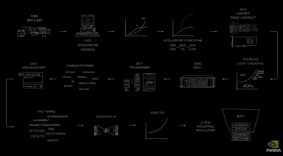 在 GTC 2024开幕演讲上,老黄回顾了一下英伟达的发展史。