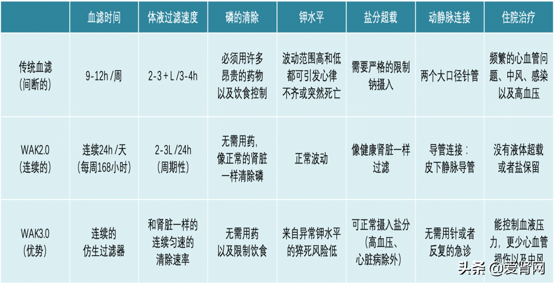 这张表对比了传统透析机与可穿戴人工肾2.0以及3.0的改进之处: