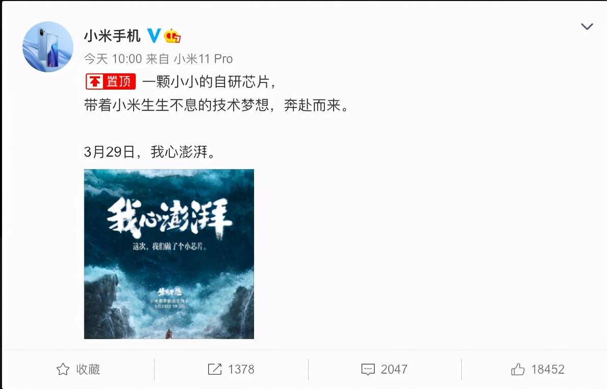 在这次发布会前三天,小米官博发布的的预热海报上,小米剧透“做了个小芯片”,并表示“我心澎湃”。预热海报上的关键词“我心澎湃”正是 4 年前小米推出自研芯片澎湃 S1 时所使用的 slogan。这还引发了不少人的猜想,有人认为是澎湃芯片会有新进展。有网友感叹“时隔多年了,终于又出了”,“我以为不研发了,现在又有新品了”...