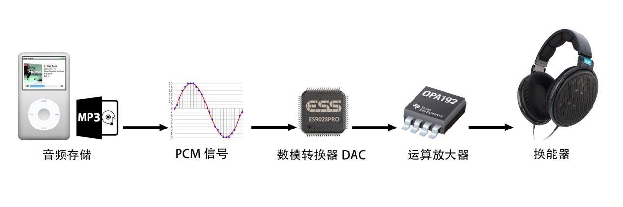 一套耳机回放系统需要经过:存读取(音源存储介质)—数转模(DAC芯片)—整流放大(放大电路)—发声单元(耳机);我们才能最终获得声音。