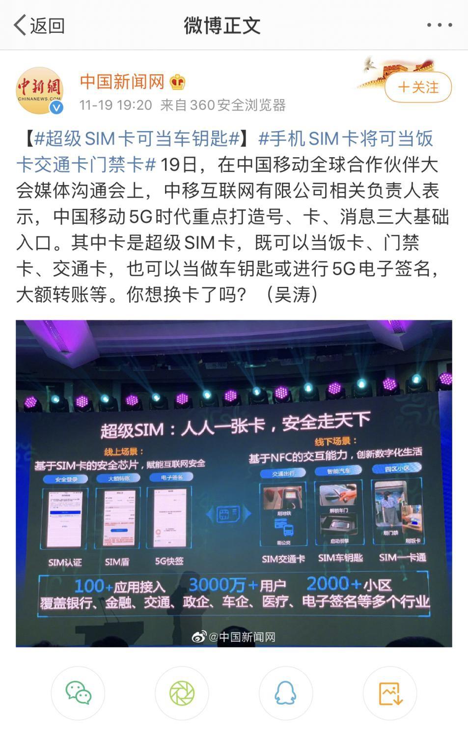 随后本月19号,中国新闻网报道,中国移动在全球合作伙伴大会媒体沟通会上发布了超级SIM卡,内含加密芯片以及NFC功能,线下可充当饭卡、门禁卡、交通卡、车钥匙;线上可以进行金融安全认证、5G电子签名以及大额转账等。