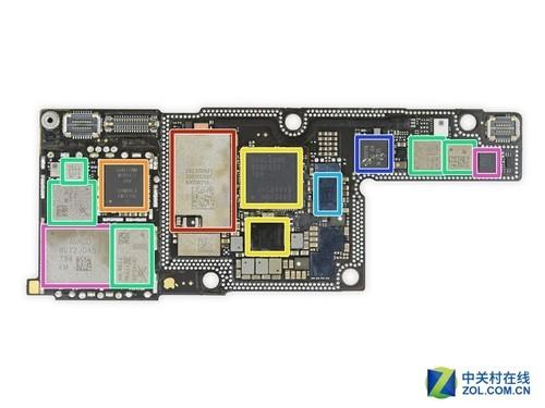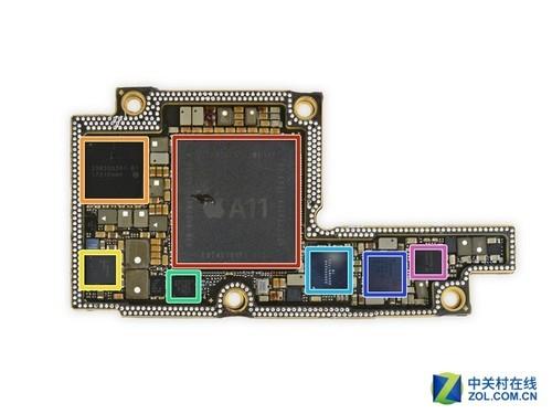 上图所示,最大的红色区块为苹果APL1W72 A11仿生处理器,且上边覆盖着SK海力士3GB内存,左方橙色为苹果338S00341-B1芯片,临近的黄色和绿色分别为德州仪器78AVZ81、NXP1612A1控制器;右方青、紫为音频编码器、电源管理IC单元。