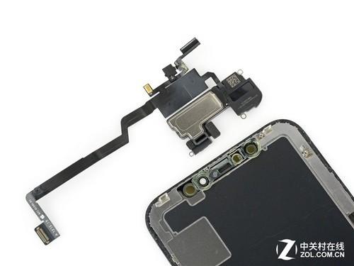 前面板模块最终拆解掉,其中包含了麦克风、环境光传感器、扬声器、反光感应元件、距离传感器等,这或许是目前手机行业中,最为复杂的面板模块了。