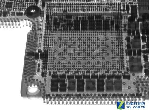 三个部分有点像最先集成化的笔记本产品,将芯片集成到一块主板,其它模块到第二块主板,第三块则是存储等元器件;而在X光的拍摄下,我们发现这三块堆叠的主板并不是采用排线链接,取而代之的是一片密密麻麻立体结构的穿孔。