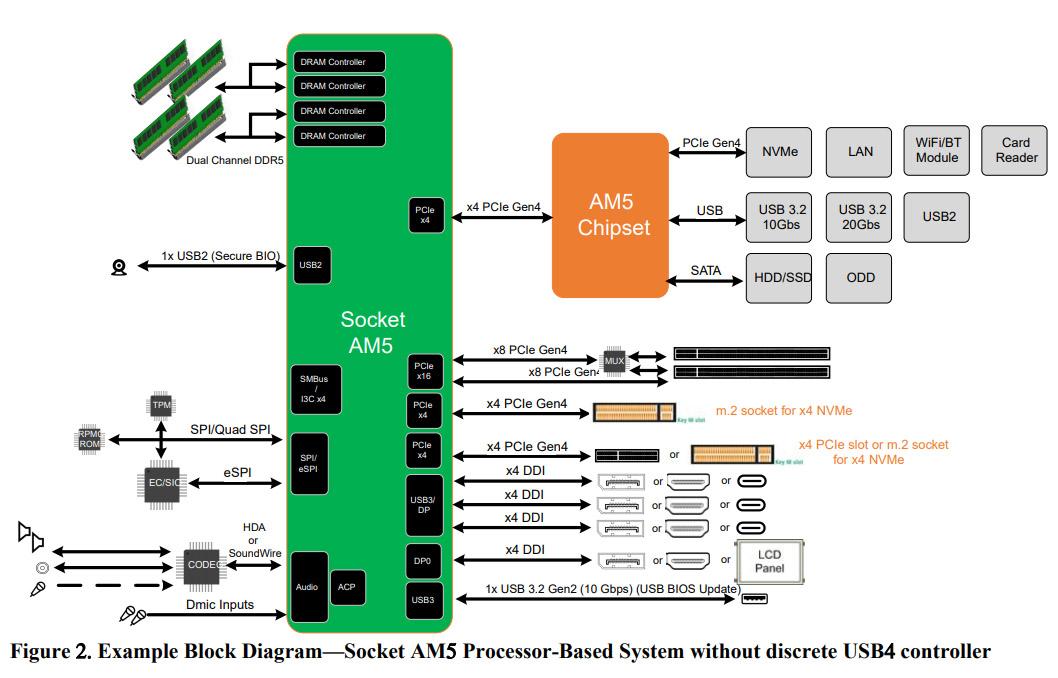 至于CPU和这两个南桥是怎么连接的嘛,从很早之前泄露的AM5平台拓扑图来看,AM5处理器只有4根PCI-E 4.0总线是用来和芯片组连接的,所以基本上就只有两颗芯片串联的这种方法,也就是IOD和其中一个FCH直连,然后这个FCH又连着另一个FCH。