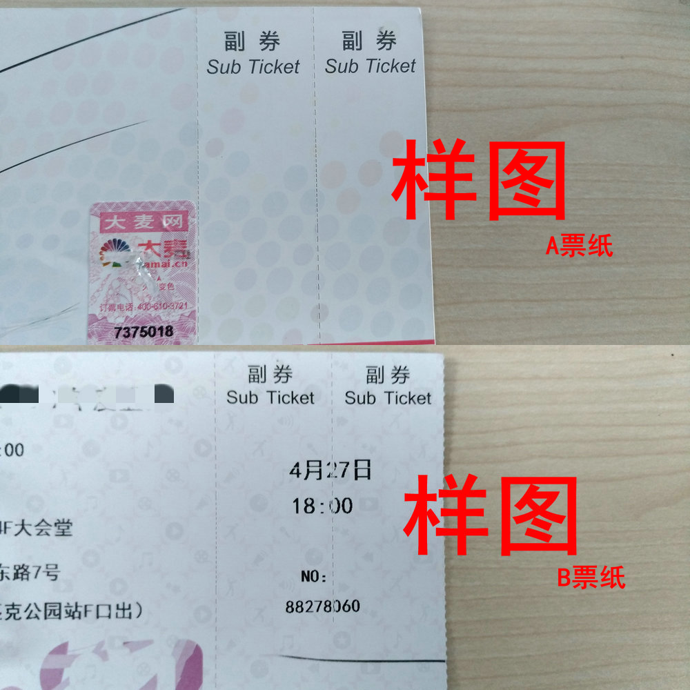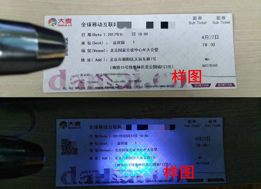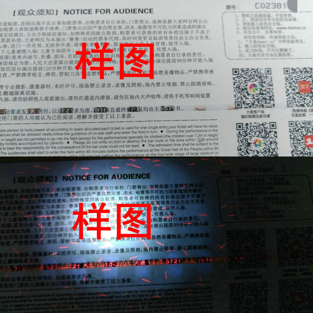 A票纸使用紫光灯(市面上常见的紫光灯365nm波段)通过正面照射票纸,正面会显示大麦水印logo。