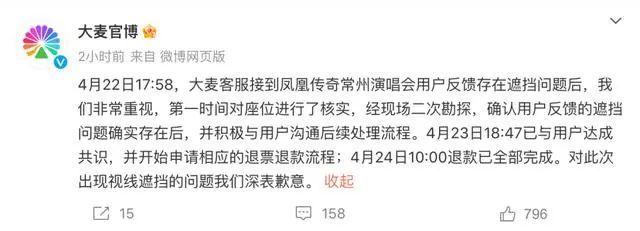 王女士将自己的经历发到社交媒体上,引发不少消费者的共鸣,随后被送上热搜。随着舆论的不断发酵,4月24日,大麦官方微博发文道歉称“上午10:00退款已全部完成,对此次出现视线遮挡的问题我们深表歉意”。
