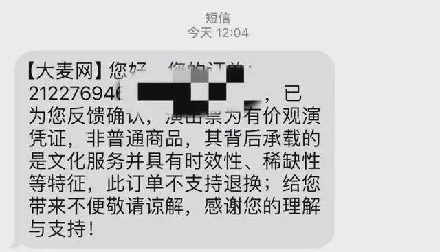 次日,王女士便联系了大麦平台,讲述自己看演唱会遇到“柱子票”的经历。大麦平台回复短信称:“已为您反馈确认,演出票为有价观演凭证,非普通商品,其背后承载的是文化服务并具有时效性、稀缺性等特征,此订单不支持退换。”