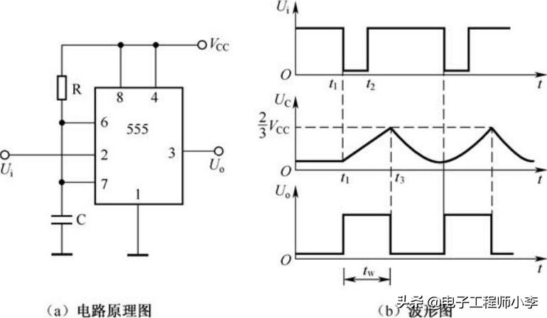 当输入信号 U i 为低电平,使555的②脚电位低于(1/3) V CC 时,555的③脚输出高电平电压,而且它内部的放电管截止,此时, V CC 通过 R对 C充电。当 C两端的充电电压超过(2/3) V CC 后,555内的 RS触发器翻转,③脚输出低电平电压,同时它内部的放电管导通,通过⑦脚使C快速放电。C充电到(2/3) V CC 的时间就是波形的高电平宽度,即 t W =1.1 RC 。