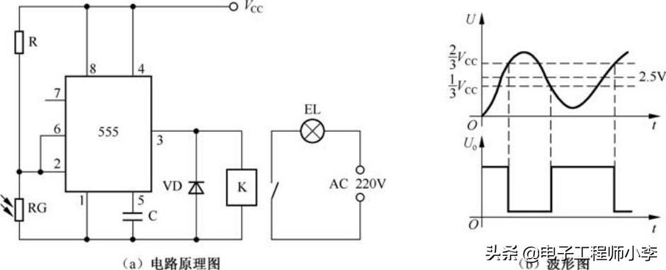 无光照时,光敏电阻RG的阻值较大,电源 V CC 通过R分压后提供电压为(1/2) V CC ,而555的⑤脚电位在C的作用下低于(1/2) V CC ,所以555的③脚电位为低电平,不能为继电器K的线圈供电,K的触点闭合,接通EL的供电回路,EL发光。有光照时,RG的阻值迅速变小,使555 的②、⑥脚电位低于(1/3) V CC 后,555的③脚输出高电平电压,该电压使K的线圈产生磁场,致使K内的触点释放,EL熄灭,实现灯光的自动控制。