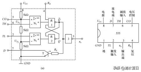 当2脚触发输入端 TL 的电压小于VCC /3,则此比较器的输出为 0,可使 RS 触发器置 1,使输出端 OUT=1。