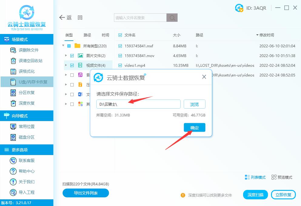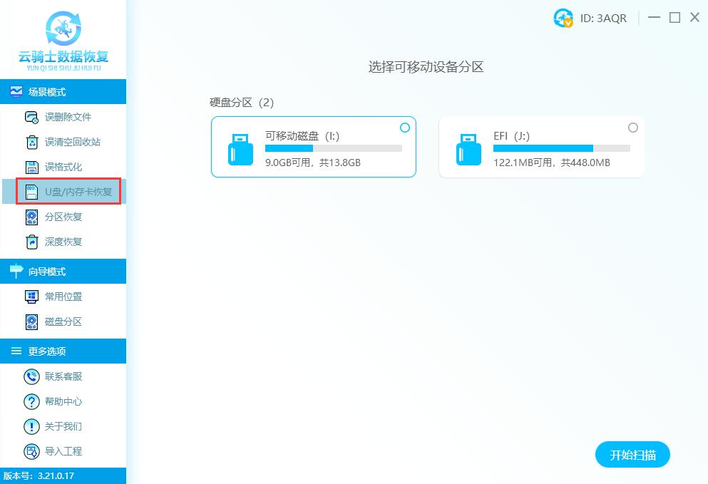 启动云骑士数据恢复软件,要从三星存储卡恢复数据,可选择u盘/内存卡恢复功能以开始使用。