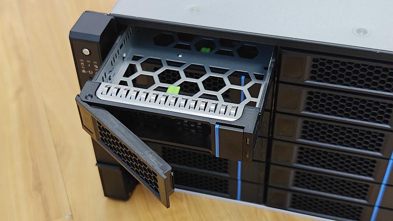 36盘位设计,是当下4U服务器机箱中为数不多的旗舰配置,兼容24个前置3.5" HDD(兼容 2.5"HDD/SSD)和12个后置3.5"HDD(兼容 2.5"HDD/SSD),可选配NVME硬盘,均采用模块化设计,免螺丝安装和免工具拆卸,方便企业后期根据自身需求搭建和维护,每个盘位都有独立的状态显示灯,方便用户及时清楚的观察硬盘的运行状况。
